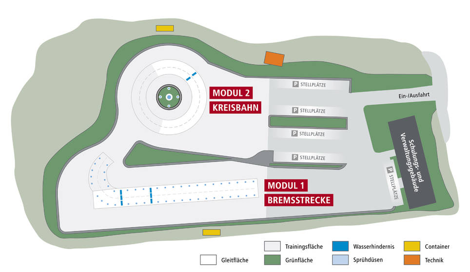 In diesem Modul trainieren Sie die Kurvenfahrt auf glatter Fahrbahn mit all den möglichen fahrphysikalischen Tücken. Fahrtechnische Assistenzsysteme werden hier auf den Prüfstand gestellt.